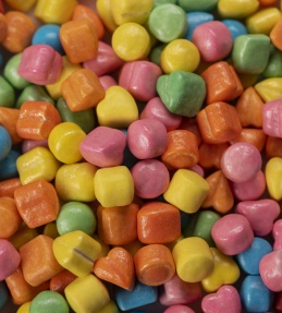 Goma de mascar confitada en forma de bola de diferentes colores. (Azul, rojo, amarillo, naranja, verde, rosa, blanco) con sabor a frutas.